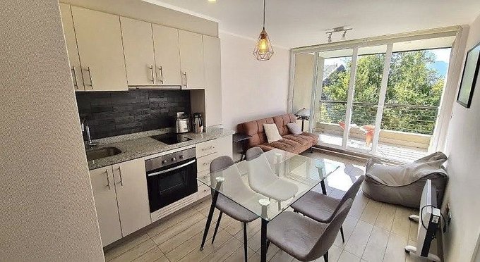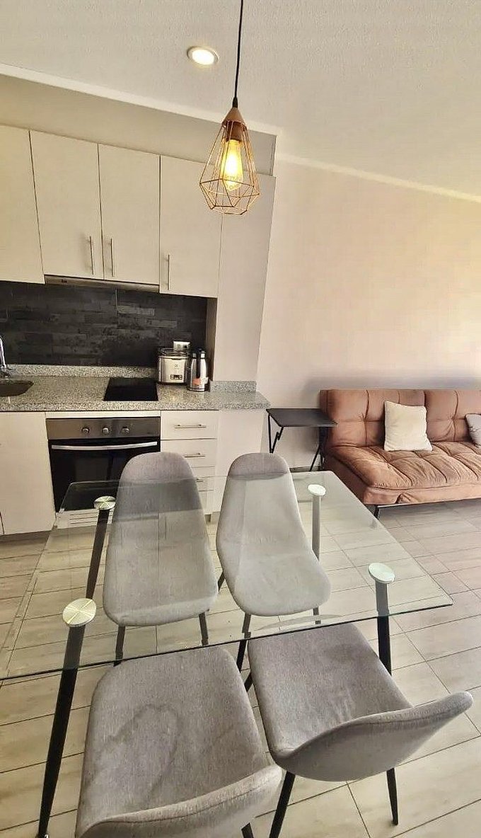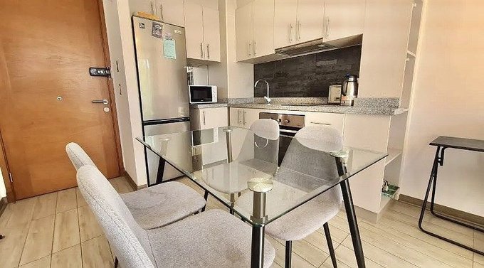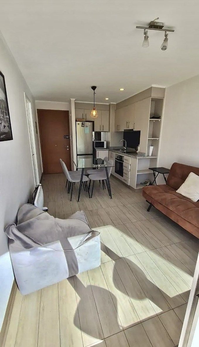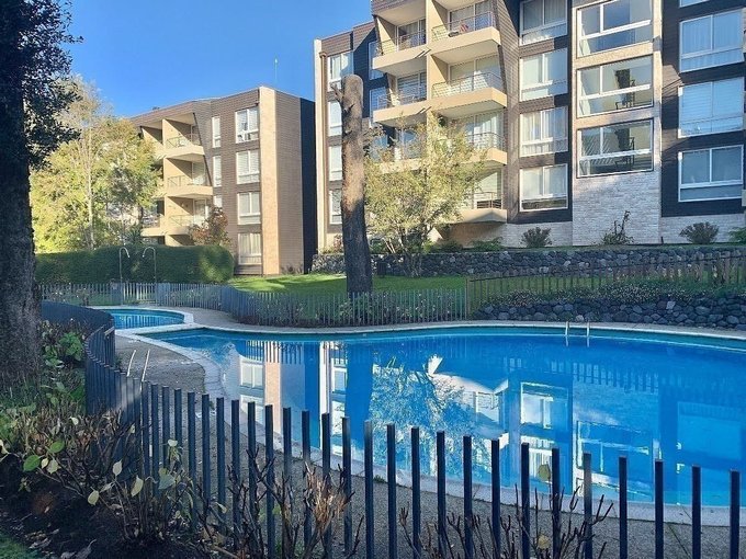 Lindo departamento en condominio Parque Payllahue, camino al volcán de 1 dormitorio y 1 baño en suite, cocina americana con cubierta de granito, horno y encimera eléctrica, caldera para agua caliente, terraza con orientación NorOriente, termopanel en todo el departamento, estacionamiento de superficie y bodega.