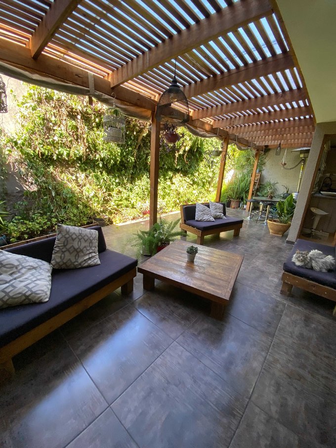 Vivir el Exterior: El living y la cocina conectan con una terraza encantadora, rodeada de una frondosa enredadera que crea un microclima fresco y privado, ideal para tardes de verano.
