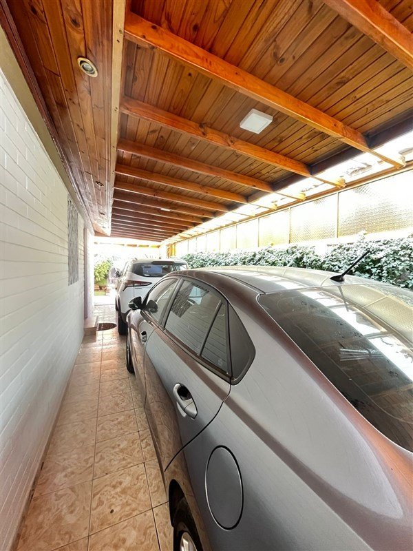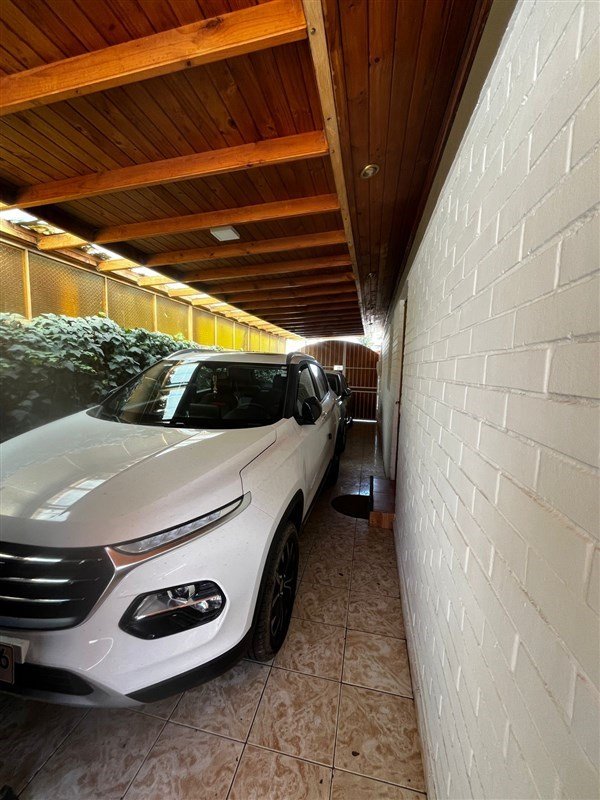 Estacionamiento techado para dos vehículos, con vigas a la vista y piso cerámico