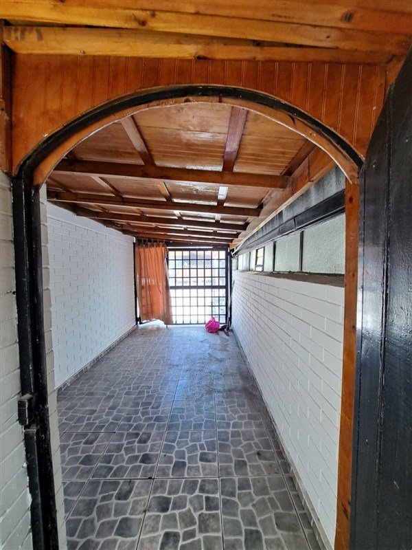 Patio lateral y trasero, todo con cerámica, la parte lateral con hermoso cobertizo con vigas a la vista.