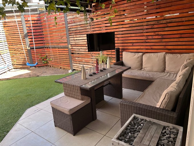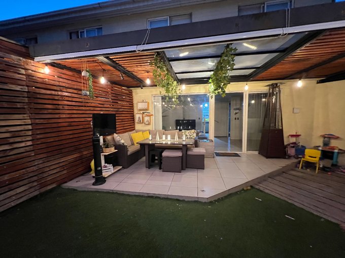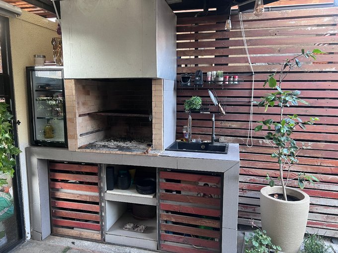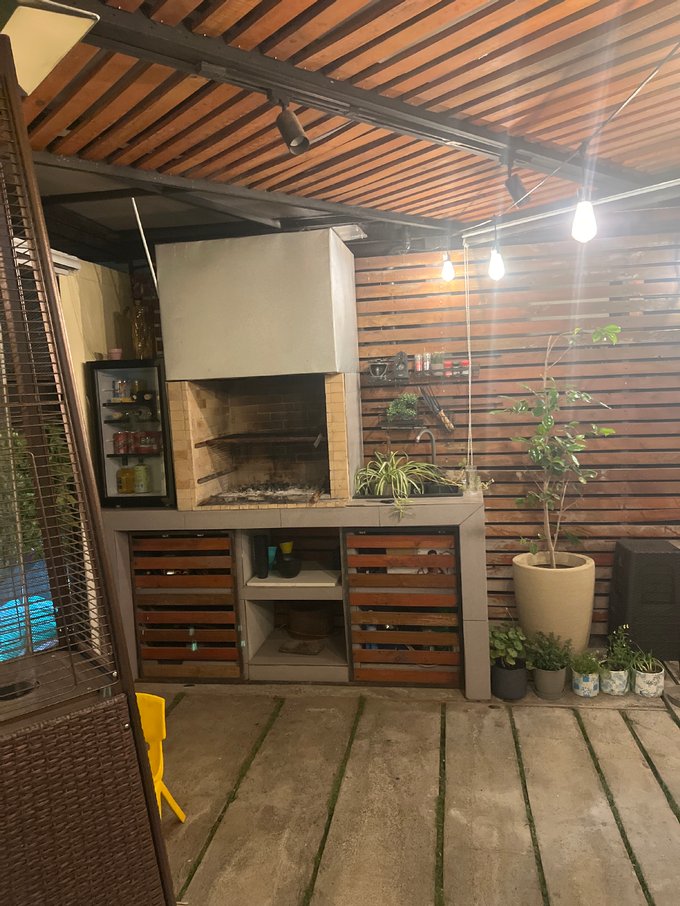 Patio con terraza y quincho,techado hasta el ante jardín, con portón eléctrico y riego automático.