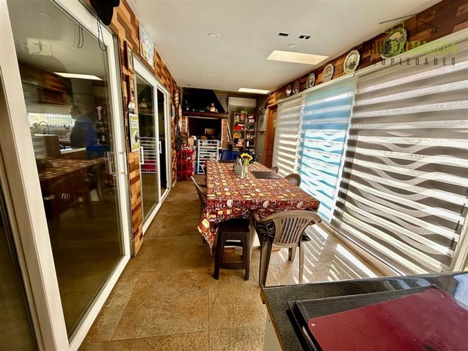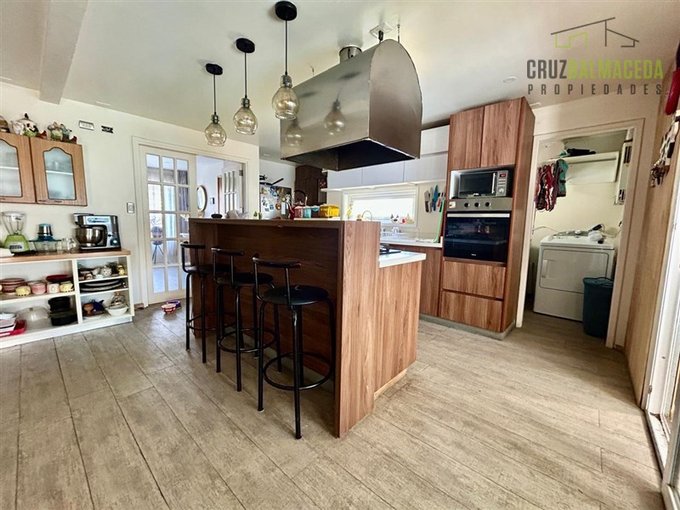 Hall de entrada, amplio living con chimenea, comedor con cocina integrada, quincho cerrado con parrilla, baño, loggia y bodega exterior.