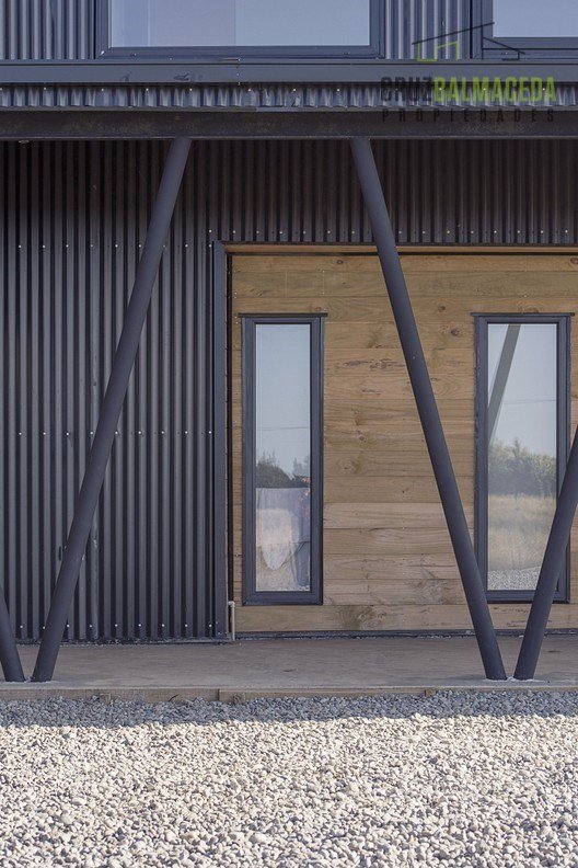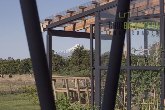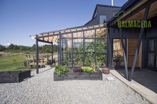 Cuenta con una terraza techada y un hall de acceso junto a un cálido invernadero de vidrio y metal.