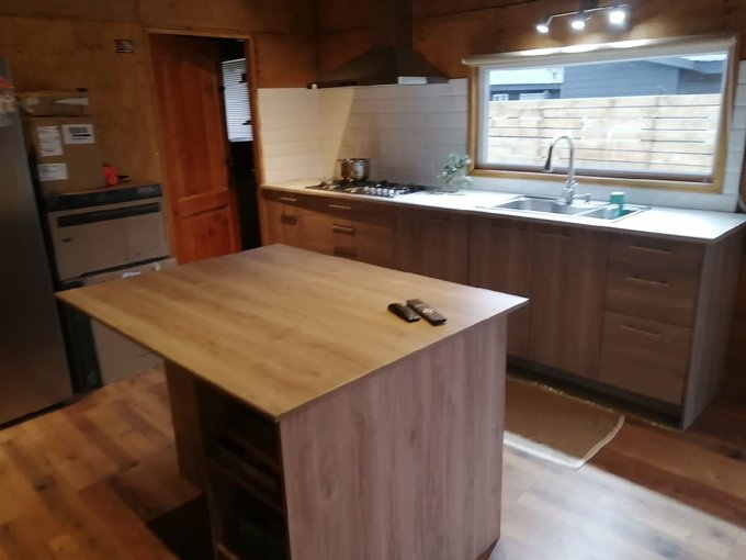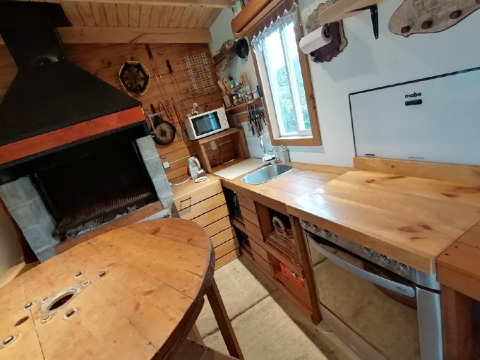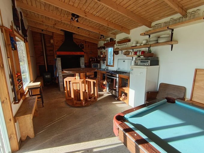 - Cabañas: Son 3 cabañas de 34m2 c/u completamente amobladas, constan de 1 dormitorio y 1 baño, estar con cocina en concepto abierto, calefacción a pellet, logia con secadora/lavadora, c/u con medidor propio de luz, estacionamiento, en terreno independiente con acceso propio al interior de los 5000m2.