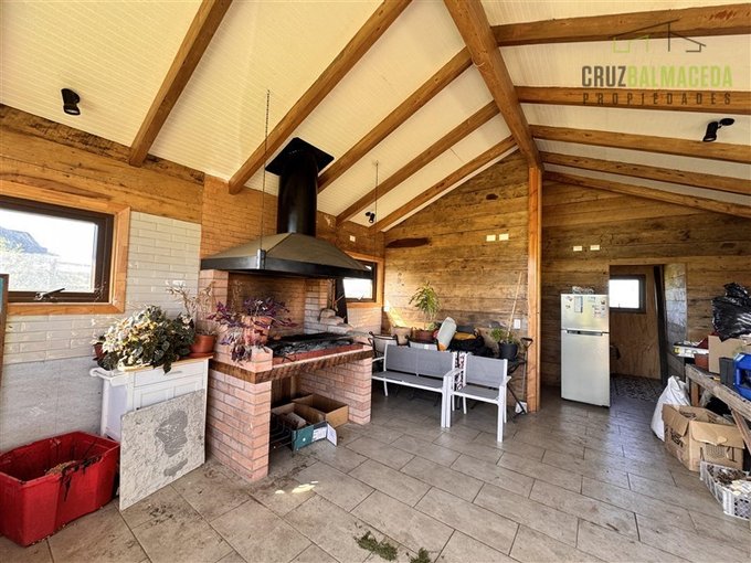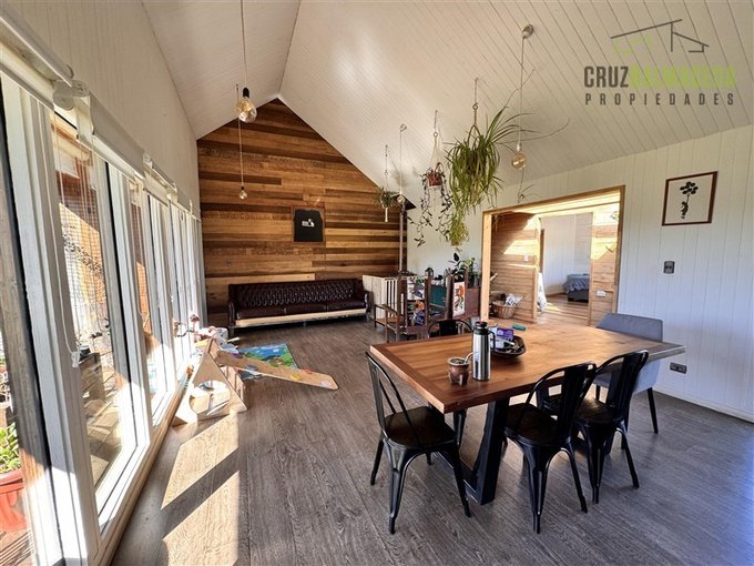 Revestimiento exterior de tejuelas, interior mezcla de nativos y muros con vulcanita. Ventanas termopanel.