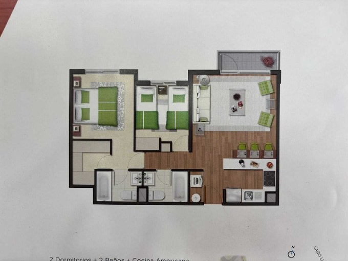 2 dormitorios, 2 baños, cocina amoblada y equipada con encimera, horno y campana. Con logia abierta y lavadero.