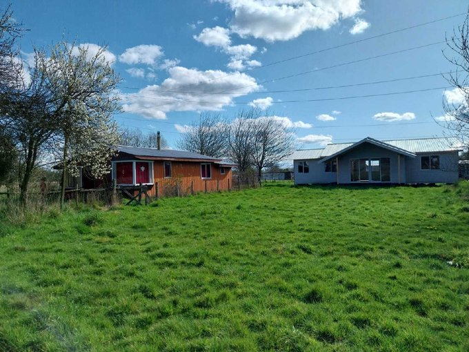 La propiedad cuenta con dos casas, ambas de madera y construidas sobre pilotes de cemento. Una de ellas es antigua y cuenta con 54 m2 aproximadamente, dos dormitorios y 1 baño. La otra de 92 m2, con alto avance de construcción, realizada en con buena aislación en muros y cielos, planchas de OSB y revestida externamente en siding fibrocemento e interior con mdf ranurado, piso madera terciada estructural. Esta tiene 3 dormitorios y dos baños, living comedor con cocina americana, ventanales de pvc con vidrios simples, sector terraza techada.