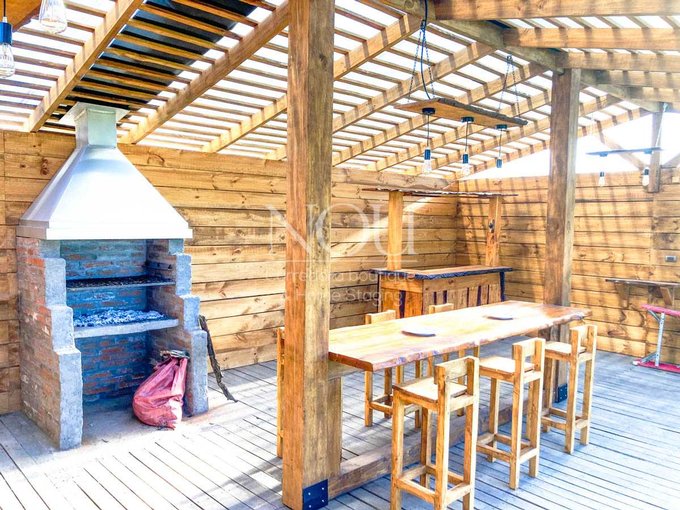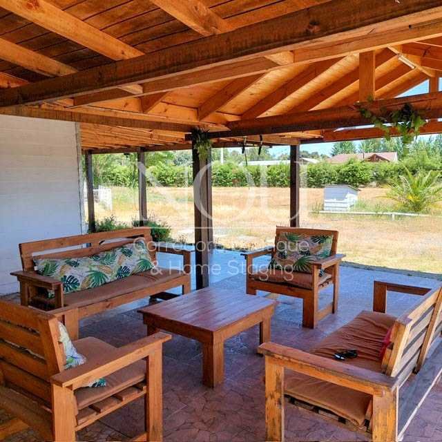 Quincho frente a sector piscina de 35 Mt2 completamente equipado con muebles rústicos, asador y chimenea.