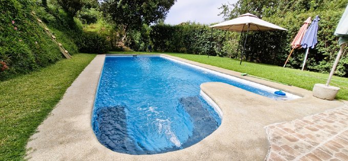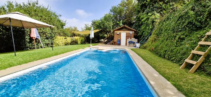 El terreno está ubicado en una loma, por lo tanto es una parcela con declive, que cuenta con dos explanadas, una con un gran quincho de 50 m2., de albañilería afinada y otra con una piscina de 12 m. x 4 m. y otras terrazas en la ladera, en donde se ubica gran variedad de árboles frutales y ornamentales.