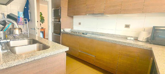 Posee un cómodo hall de acceso, un living comedor iluminado por la gran terraza de 13 metros de largo, una cocina con cubiertas de granito eternas, cocina encimera eléctrica, 2 hornos empotrados, doble lavaplatos, conexión de lavadora y mucho espacio para guardar, junto con una gran logia. Una oficina especial para teletrabajo. Tres modernos baños, tres dormitorios con closets y el principal con walk-in closet y baño en suite.