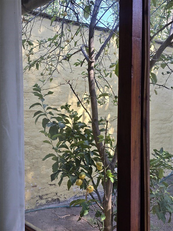 Pasillo que conduce a dormitorios y patio central con pileta y vegetación.