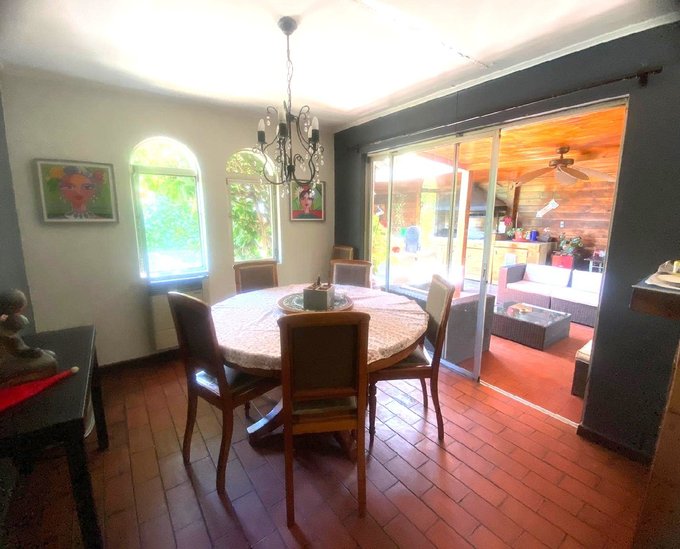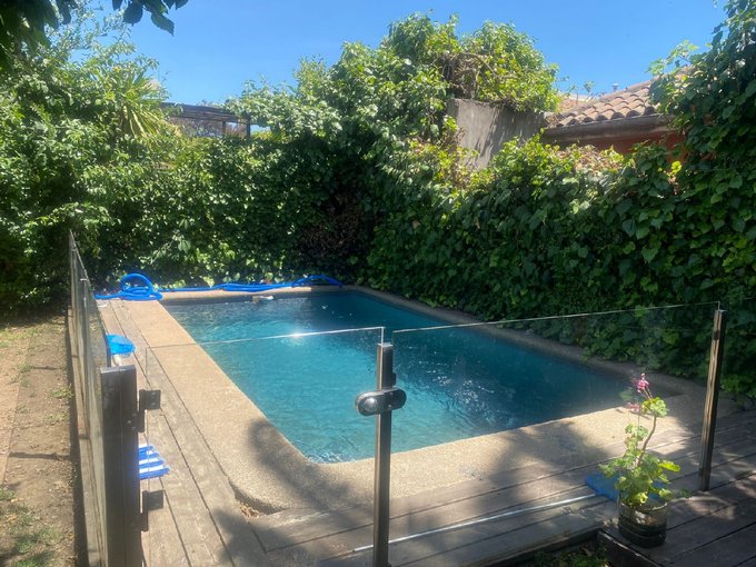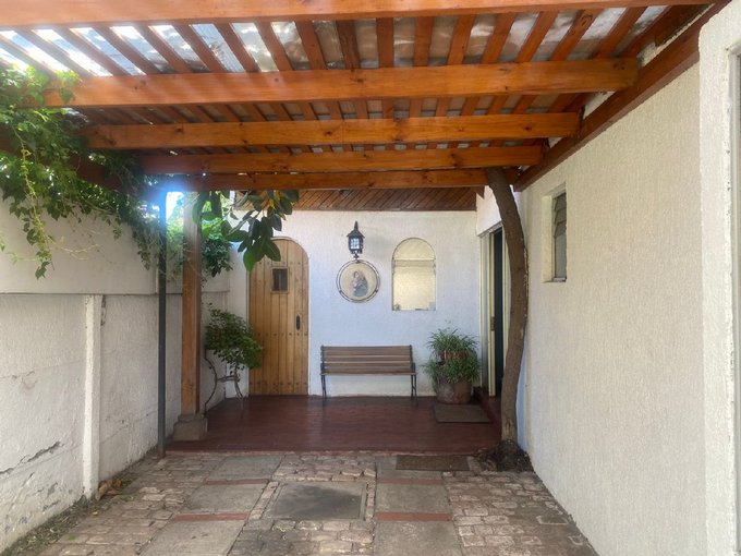 Patio amplio cuenta con estacionamiento para dos vehículos grandes, bodega, piscina y quincho.