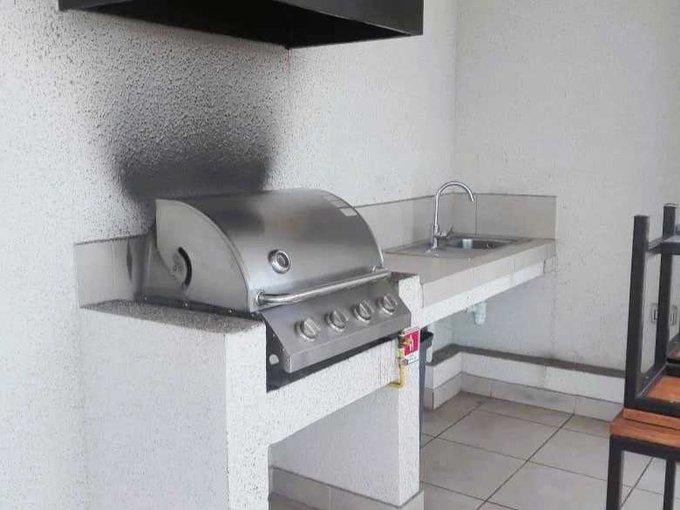 - Cocina americana amoblada, con mesón de granito, horno, encimera y campana, todo eléctrico.