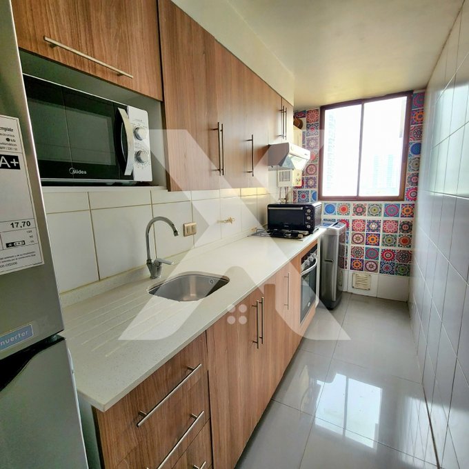 Amplio departamento en piso 6, de 2 dormitorios amplios; 2 baños, principal con vanitorio y shower door, segundo con vanitorio y media tina; cocina tradicional amoblada y equipada con encimera a gas y horno eléctrico; estar comedor con salida a balcón.