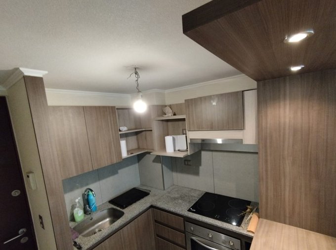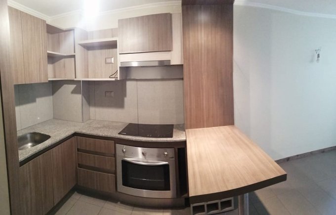 Cocina amoblada y equipada con campana, horno y cocina encimera vitro-cerámica eléctrica.