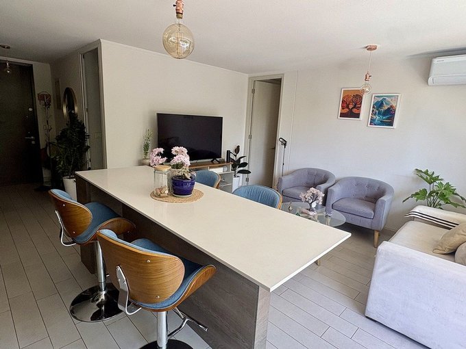La cocina integrada está completamente equipada con encimera vitrocerámica, campana, horno, muebles y cubiertas de cuarzo. El departamento cuenta con pisos de porcelanato, ventanas termopanel, e incluye cortinas y lámparas.