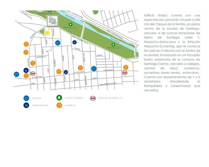 Ubicado en calle Maipú, Santiago Centro, se encuentra en un barrio residencial con excelente conectividad, fácil acceso a la locomoción y principales arterias viales, enlazando tu ritmo de vida de manera eficiente con toda la ciudad, así mismo la ubicación privilegiada de este edificio te permitirá tener acceso a la nueva línea 7 del metro de Santiago.