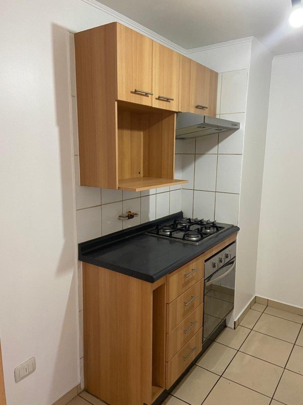 Cocina cerrada , amoblada y equipada (horno, encimera y campana) espacio para lavadora. Piso de cerámica,