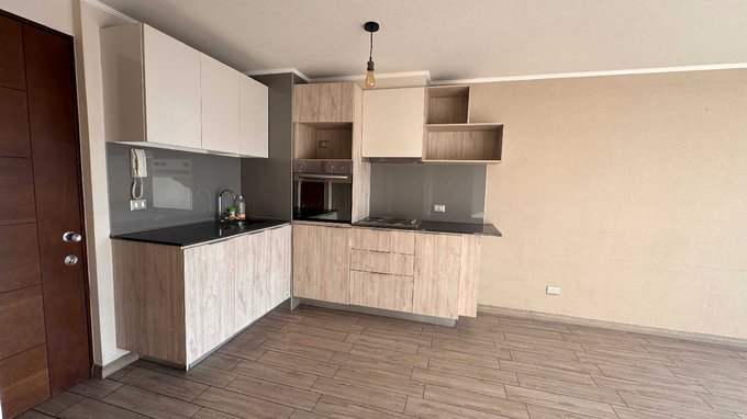La cocina integrada cuenta con kit de cocina eléctrica con encimera, campana y horno, cubiertas de granito y conexión a lavadora.
