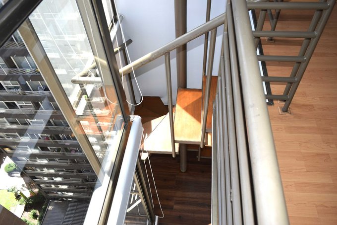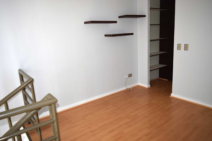 PRIMER PISO: Sala comedor, cocina americana amoblada, pequeño balcón, escalera caracol para acceder al segundo nivel.