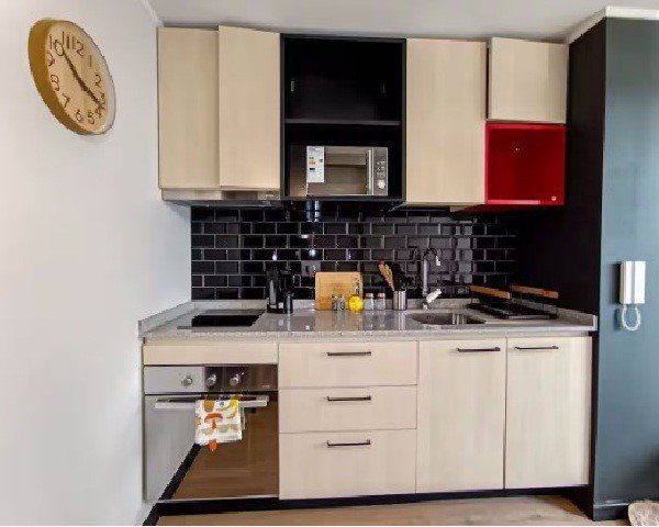 La cocina está equipada con una encimera americana, horno eléctrico y campana. El baño incluye un shower door .Acceso al departamento mediante chapa cerradura electrónica.