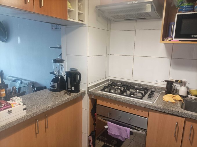 - Cocina americana amoblada, encimera a gas, horno empotrado eléctrico y campana.