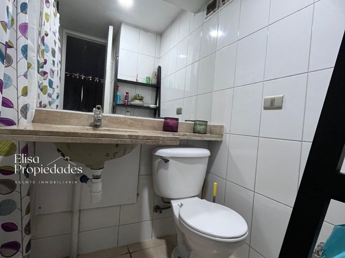 Baño cuenta con vanitorio con cubierta de mármol, cerámico muro a muro, espacio para instalación de lavadora
