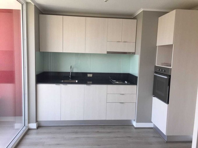 Departamento de dos ambientes con balcón, de 1 dormitorio y 1 baño. Cocina equipada, con cubierta de granito y muro de vidrio retro pintado, amoblada y equipada con encimera y horno eléctricos, campana extrahible de acero inoxidable con extracción forzada. Baño con mueble de mármol reconstituido y muros de cerámica; espacio para instalar lavadora. Ventanas de PVC con termo panel y barandas en terraza con vidrios templados.