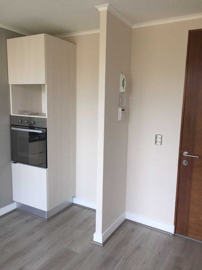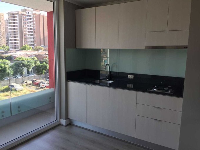 Departamento de dos ambientes con balcón, de 1 dormitorio y 1 baño. Cocina equipada, con cubierta de granito y muro de vidrio retro pintado, amoblada y equipada con encimera y horno eléctricos, campana extrahible de acero inoxidable con extracción forzada. Baño con mueble de mármol reconstituido y muros de cerámica; espacio para instalar lavadora. Ventanas de PVC con termo panel y barandas en terraza con vidrios templados.