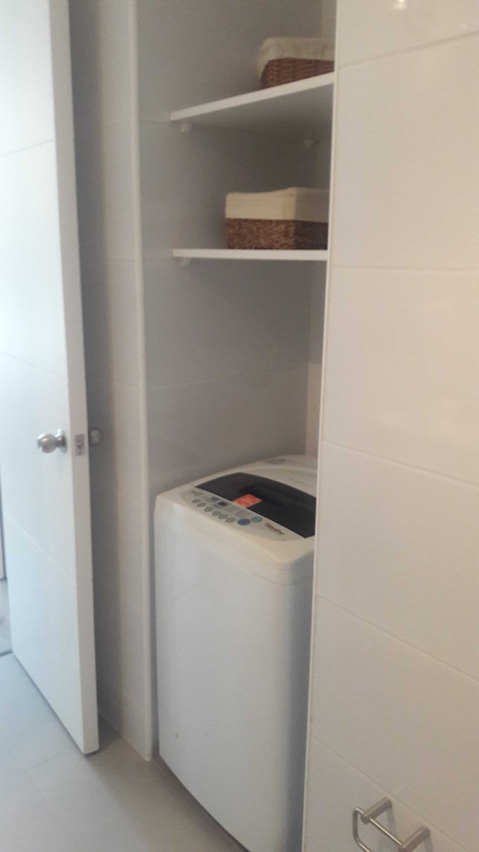 Departamento de dos ambientes con balcón, de 1 dormitorio y 1 baño. Cocina equipada, con cubierta de granito y muro de vidrio retro pintado, amoblada y equipada con encimera y horno eléctricos, campana extrahible de acero inoxidable con extracción forzada. Baño con mueble de mármol reconstituido y muros de cerámica; espacio para instalar lavadora. Ventanas de PVC con termo panel y barandas en terraza con vidrios templados.