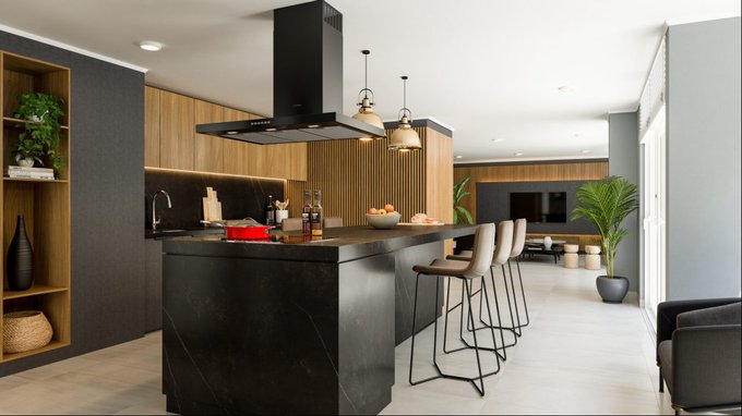 * Cocina de vitrocerámica, horno eléctrico y campana retráctil.