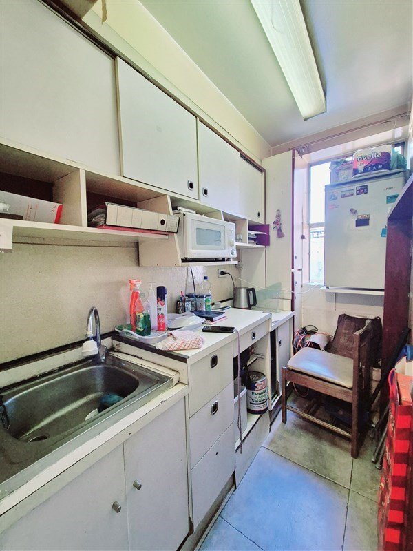 *Cocina pequeña con muebles, lavaplatos, microondas, refrigerador.