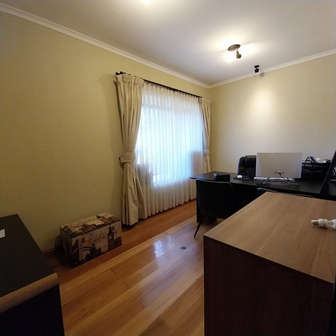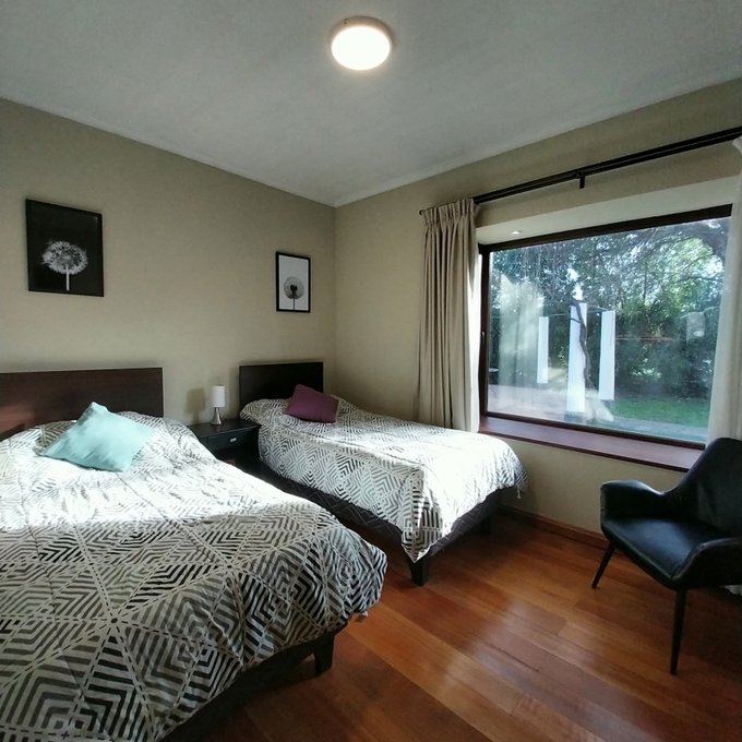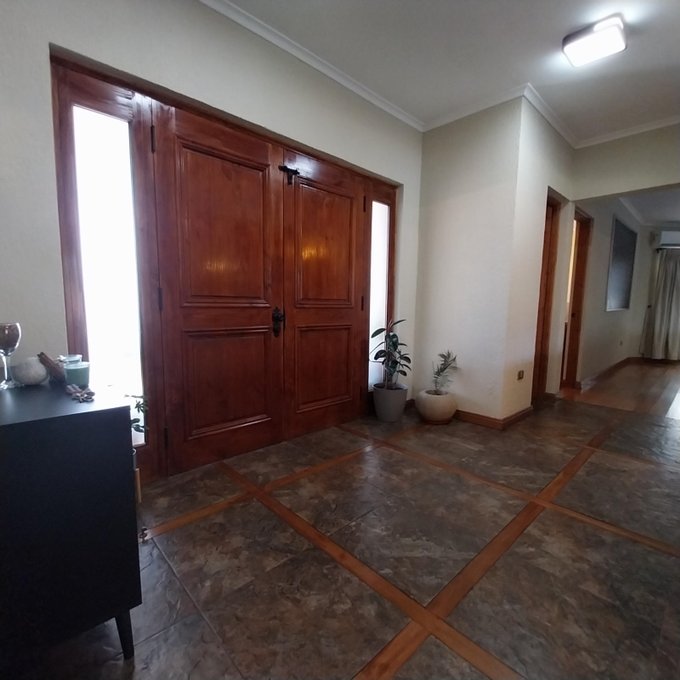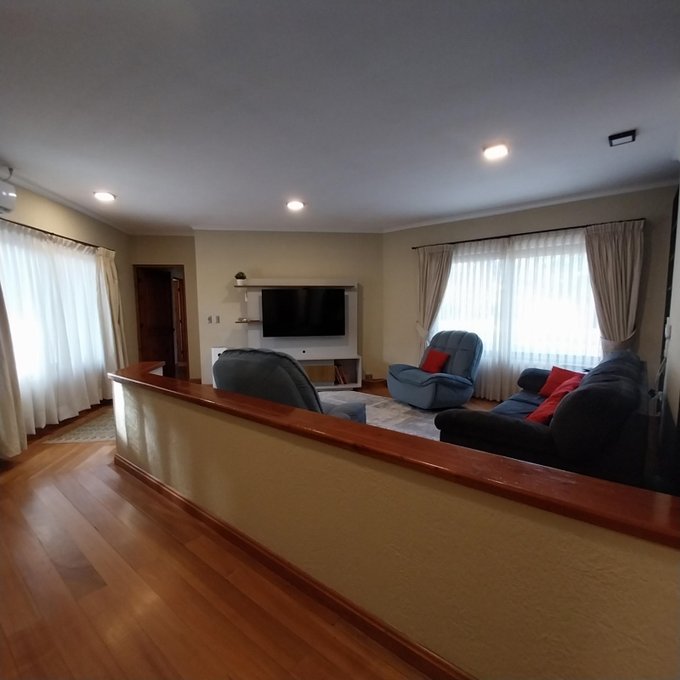 Distribución: hall de acceso, al centro living comedor luminoso, baño de visita. Ala sur: amplia cocina, pieza de servicio en suite, logia exterior parcialmente techada. Ala norte: pasillo que accede a sala de estar, oficina, 3 habitaciones, 2 de ellas en suite, dormitorio principal cuenta con walking closet, baño con sauna, jacuzzi. Estufas a pellet, y aire acondicionado en dos habitaciones. Piso flotante en sector dormitorios, cerámica y porcelanato en el resto de la propiedad. Ventanas de termopanel.