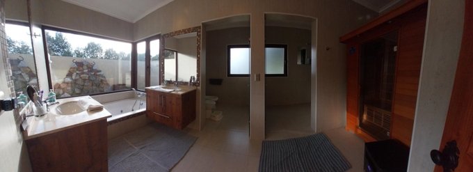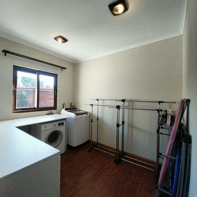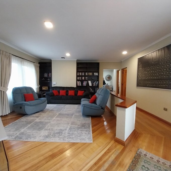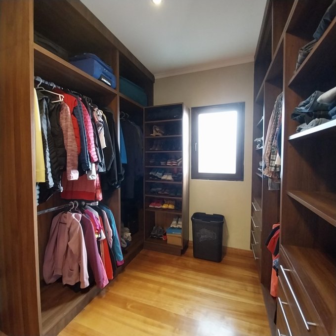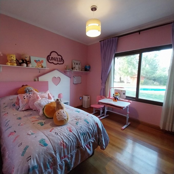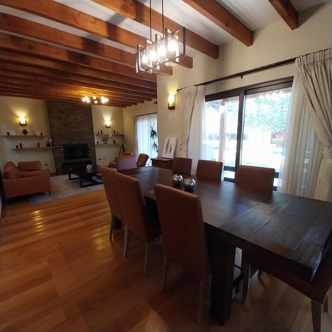 Distribución: hall de acceso, al centro living comedor luminoso, baño de visita. Ala sur: amplia cocina, pieza de servicio en suite, logia exterior parcialmente techada. Ala norte: pasillo que accede a sala de estar, oficina, 3 habitaciones, 2 de ellas en suite, dormitorio principal cuenta con walking closet, baño con sauna, jacuzzi. Estufas a pellet, y aire acondicionado en dos habitaciones. Piso flotante en sector dormitorios, cerámica y porcelanato en el resto de la propiedad. Ventanas de termopanel.