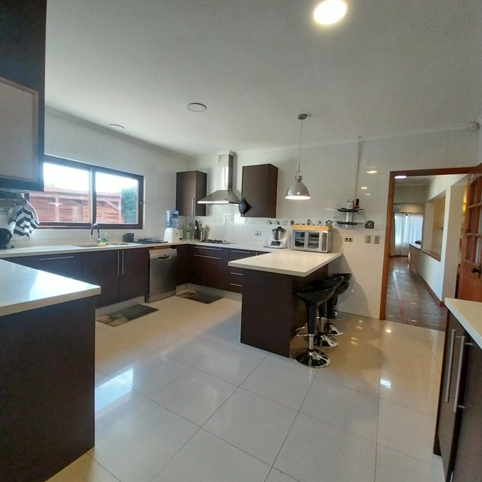 Exterior: terraza amplia techada con parrilla a gas, 7 estacionamientos techados, pérgola, 3 bodegas de 20 m2 aproximados en el exterior, baño exterior, piscina, jardín consolidado, portón y regadío automático.