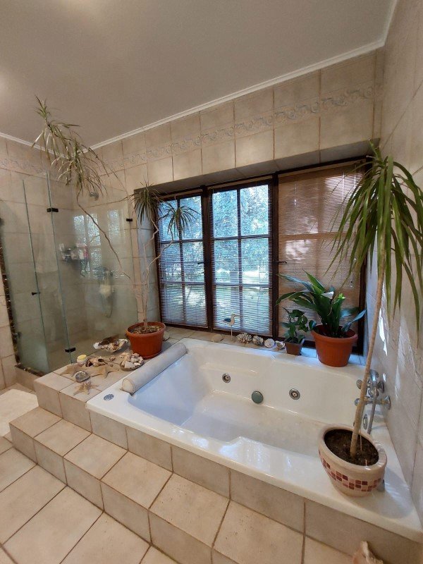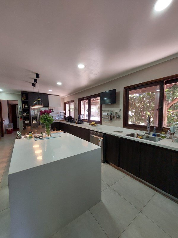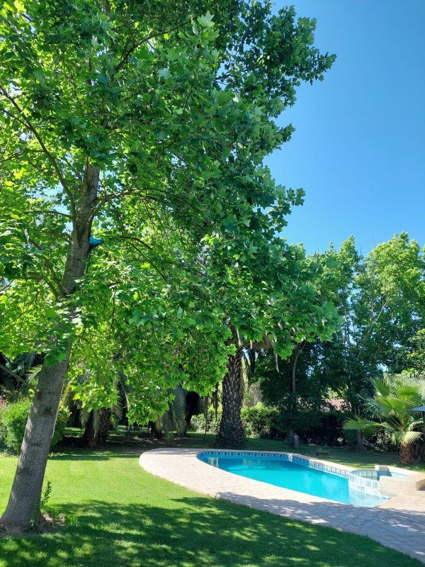 Hermosa piscina con terraza, jardín completamente formado con pasto, árboles ornamentales y frutales, estacionamiento techado para 2 autos , 5 estacionamientos sin techar .
