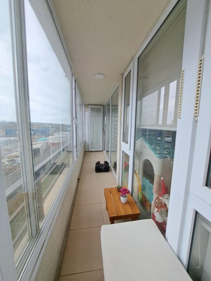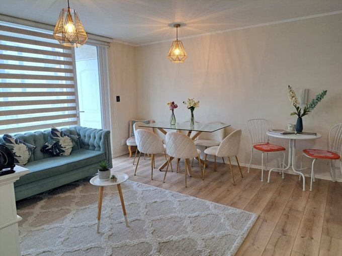 - **Interiores:** terraza amplia con ventanales, cocina americana amoblada y equipada, living comedor