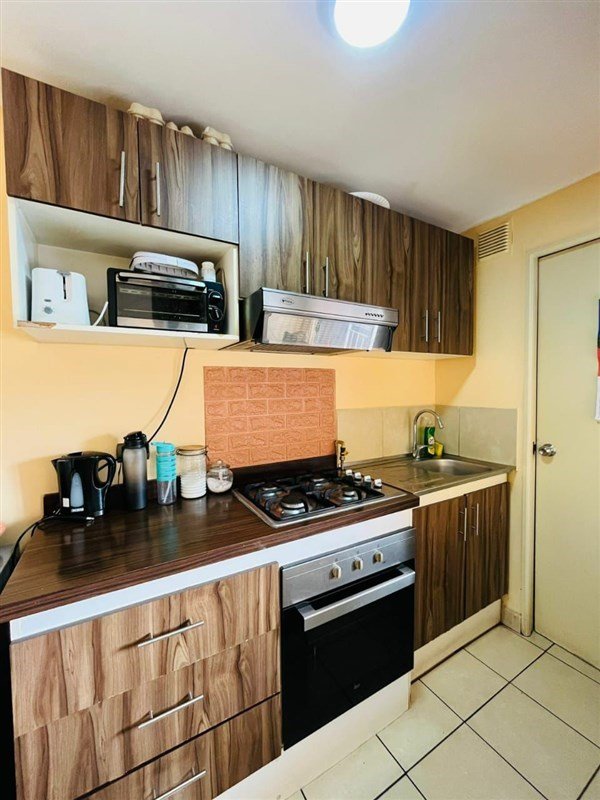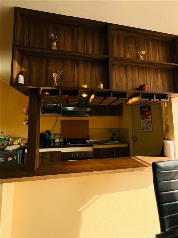 Cocina americana totalmente equipada: encimera, horno, muebles aéreos y de piso Logia con calefont e instalación para lavadora
