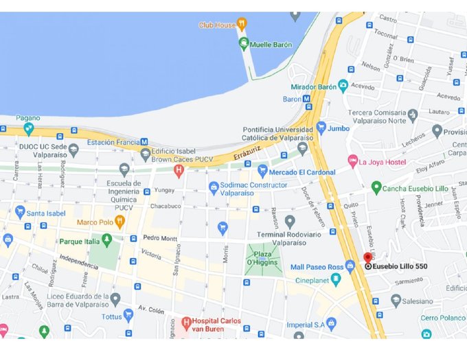En el centro de Valparaíso, a sólo 5 cuadras del metro Barón, Mall Portal Valparaíso y Universidad Católica, a una cuadra del Congreso Nacional, movilización, terminal de buses, plaza OHiggins y Mall paseo Ross, feria de frutas y verduras (miércoles y sábado), supermercados y comercio en general. También colegios cercanos como Salesianos, Colegio San Ignacio, San Pedro Nolasco, Barros Luco y Escuela Alemania. Casi en plena Av. Argentina que conecta directo con Ruta 68 a Santiago.