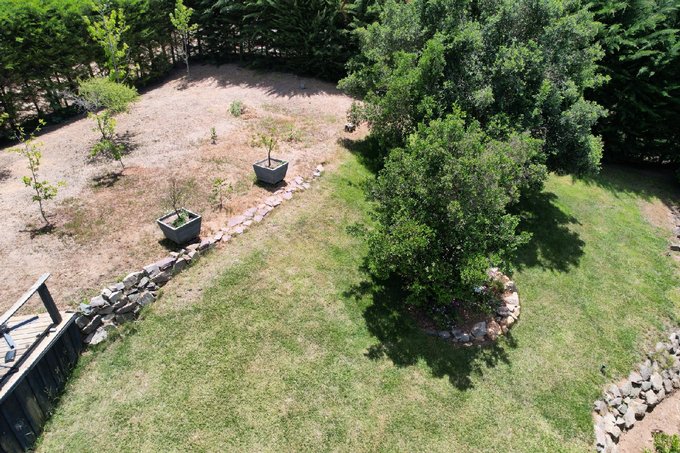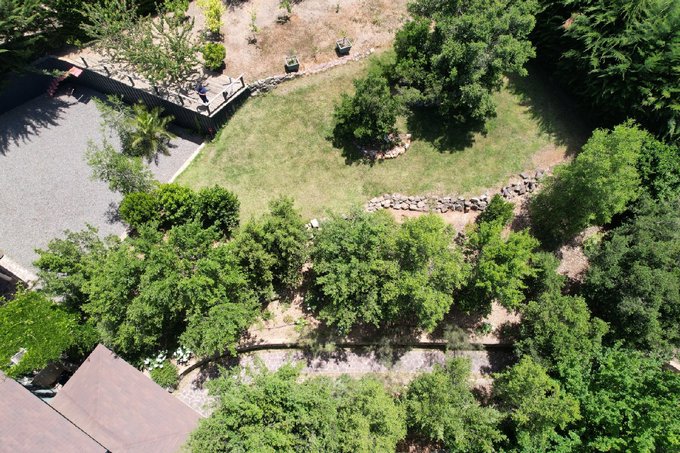 Dos cómodas terrazas comedor aire libre insertas en jardín rodeadas de árboles.