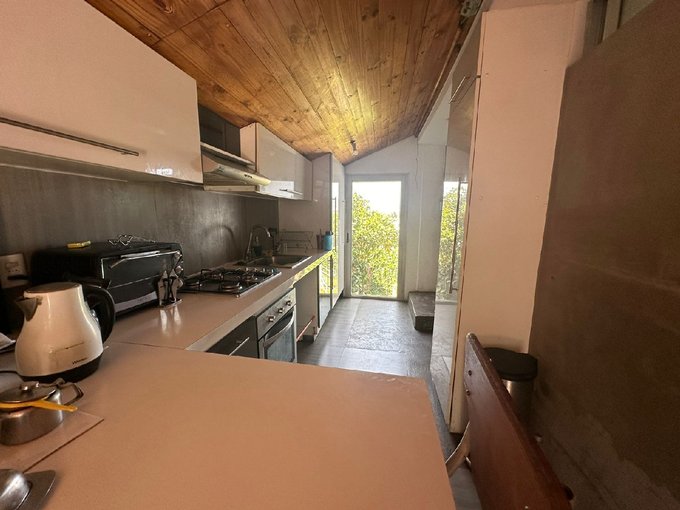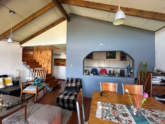 Living- comedor con vigas a la vista, muy luminoso, cocina amoblada, logia, salida a patio, comedor de diario.
