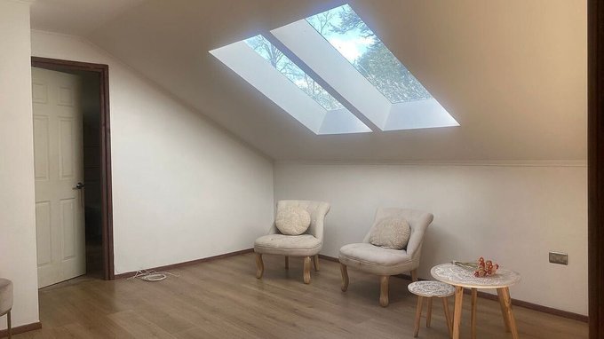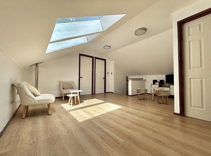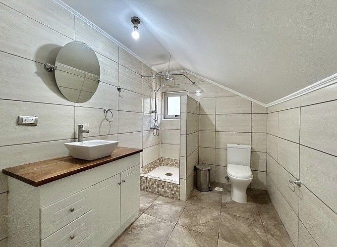 En primero piso : living comedor con salida a la terraza con estufa a pelet, cocina integrada, pieza en suite, lavadero interior y pieza principal en suite con Woking close y salida a terraza.