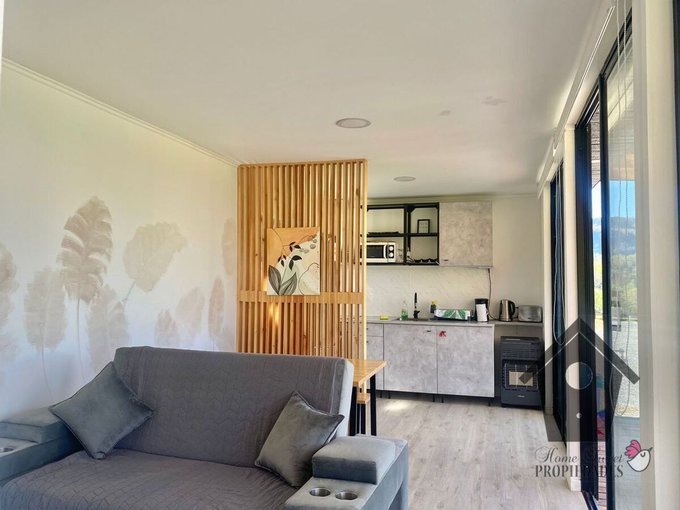 Construcción modular sobre pilotes de acero diseño tipo container con tabiques bien aislados y ventanales con termopanel fácil de ampliar. Cocina full eléctrica, amoblada y equipada con encimera vitrocerámica, horno eléctrico empotrado y campana extractora inox. Agua caliente con termo eléctrico. Terraza techada con deck de madera. Hot-Tub de fibra de vidrio revestida en madera y calefactor a leña. Provisión de agua potable del condominio y energía eléctrica CGE con canalización subterránea. Solución sanitaria instalada y funcionando.