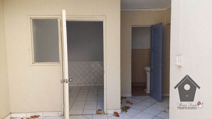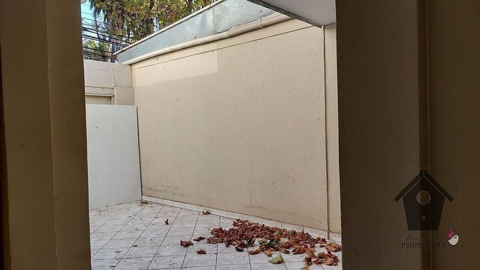Exteriores: Hacia la calle un antejardín y un estacionamiento auxiliar y acceso al estacionamiento cerrado y al patio de servicio. Interiormente tiene un patio de servicio desde donde se accede a un baño completo y una habitación (dependencias).