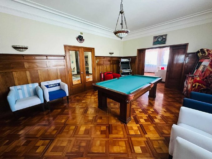 Sala de juegos equipada con mesa de pool y consolas arcade, conectada fluidamente con el comedor