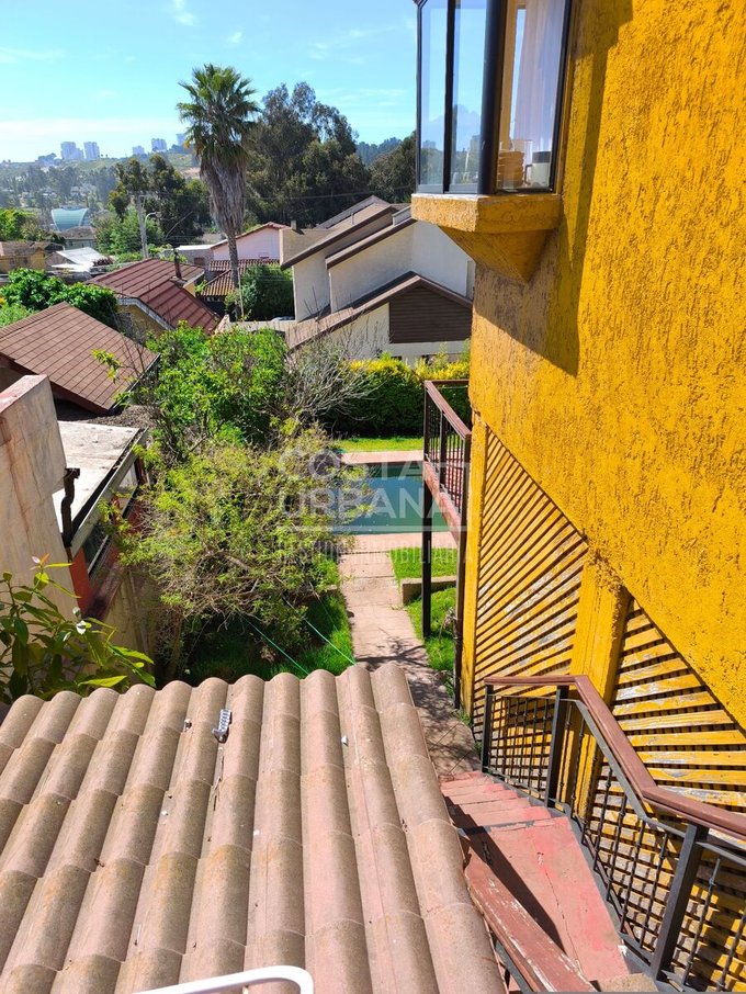 - Living con ventanal que da salida a terraza en altura con vista lejana al mar, escalera conecta a patio trasero, sector piscina.