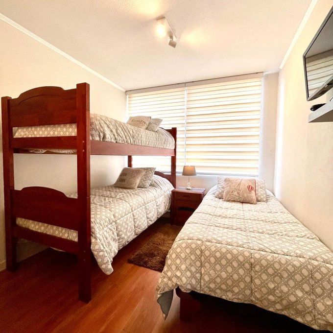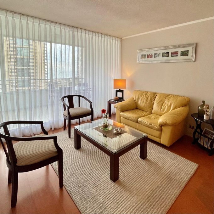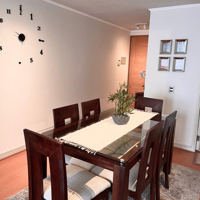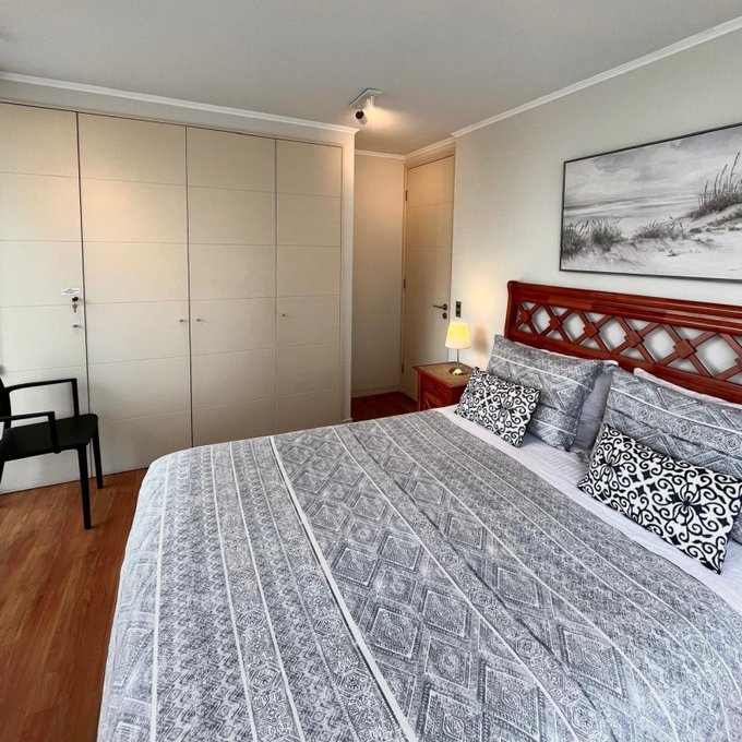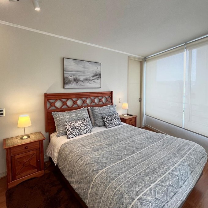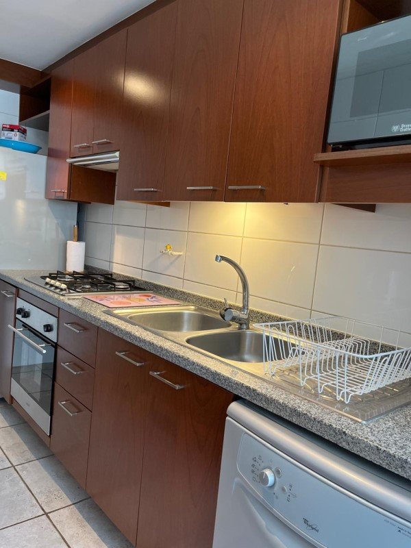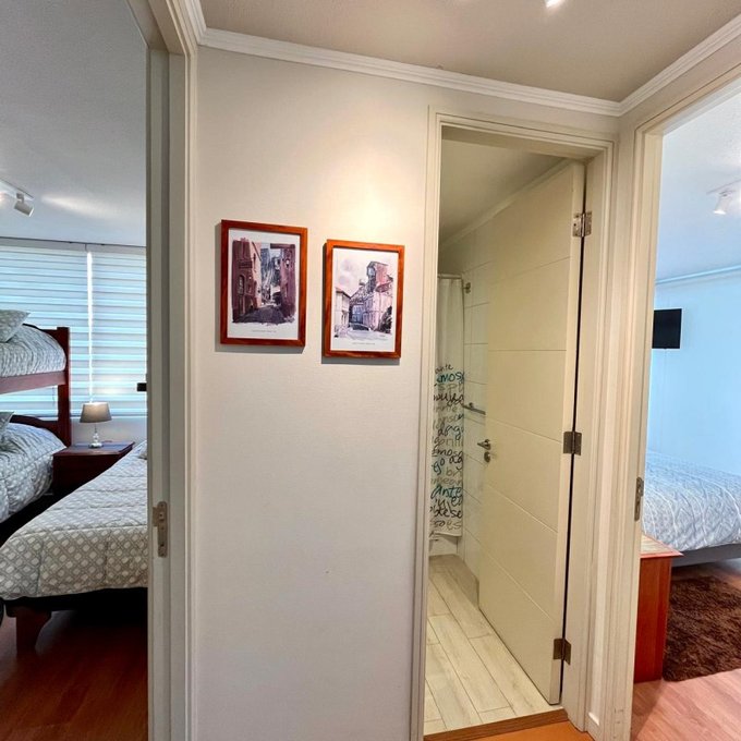 La propiedad cuenta con: 2 dormitorios con clóset (principal en suite) y 2 baños. Dispone de una amplia cocina tradicional amoblada y equipada a gas natural, con comedor de diario, ventilación natural y campana, en impecable estado. El living-comedor se integra a una acogedora terraza con malla de protección y ventanales con cierre, ideal para disfrutar durante todo el año. Presenta piso flotante en dormitorios y living-comedor, cerámicos modernos en baños, ventanas con mallas de protección, focos y lámparas modernas, además de cortinas roller y blackout en dormitorios. Incluye cerradura electrónica con conexión WIFI. Superficie total de 81 m. Cuenta con estacionamiento y bodega.