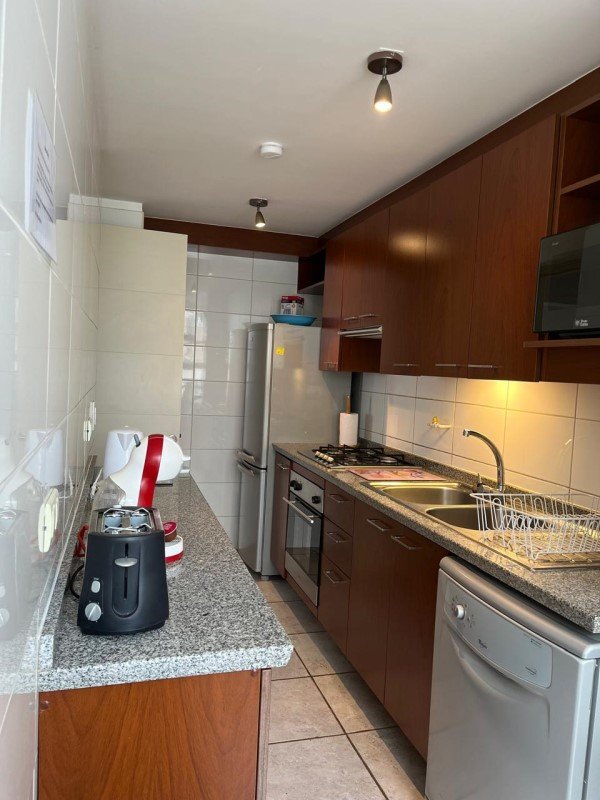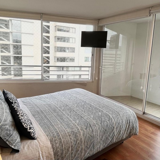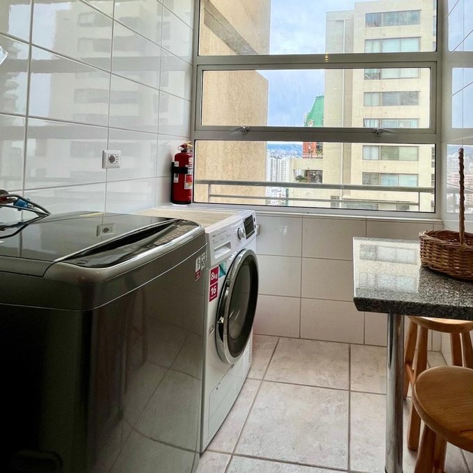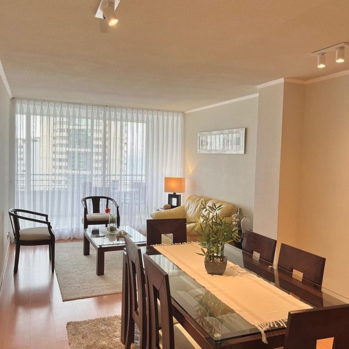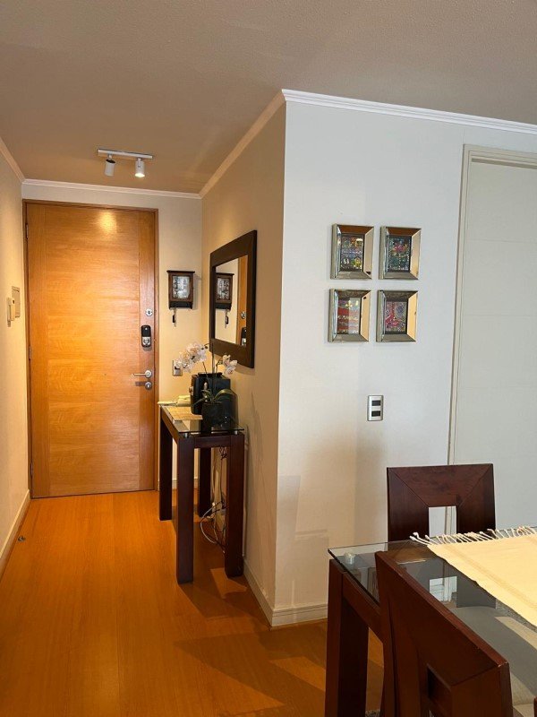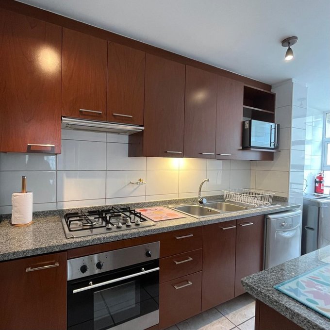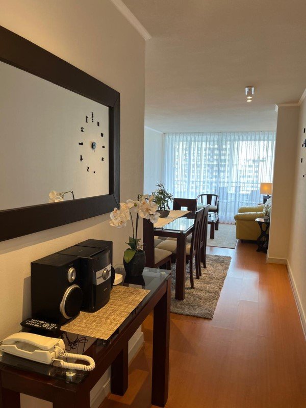 La propiedad cuenta con: 2 dormitorios con clóset (principal en suite) y 2 baños. Dispone de una amplia cocina tradicional amoblada y equipada a gas natural, con comedor de diario, ventilación natural y campana, en impecable estado. El living-comedor se integra a una acogedora terraza con malla de protección y ventanales con cierre, ideal para disfrutar durante todo el año. Presenta piso flotante en dormitorios y living-comedor, cerámicos modernos en baños, ventanas con mallas de protección, focos y lámparas modernas, además de cortinas roller y blackout en dormitorios. Incluye cerradura electrónica con conexión WIFI. Superficie total de 81 m. Cuenta con estacionamiento y bodega.