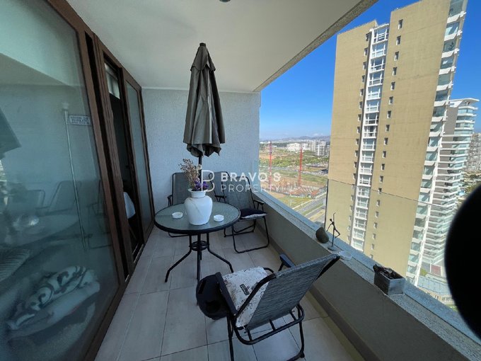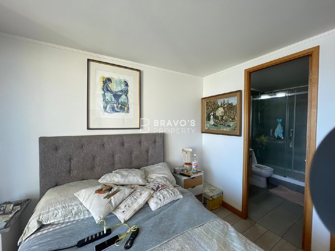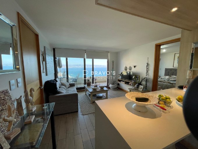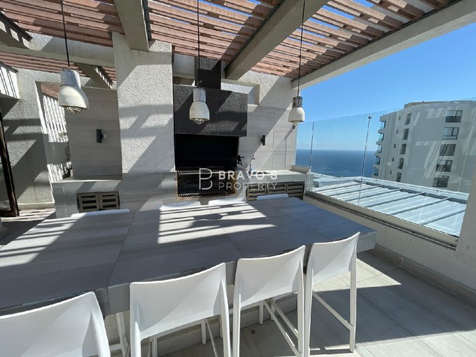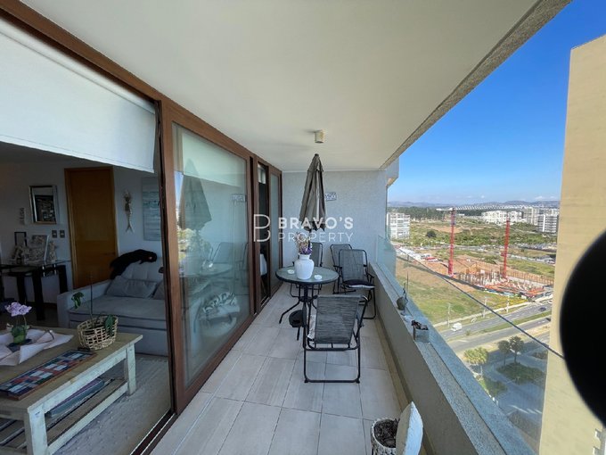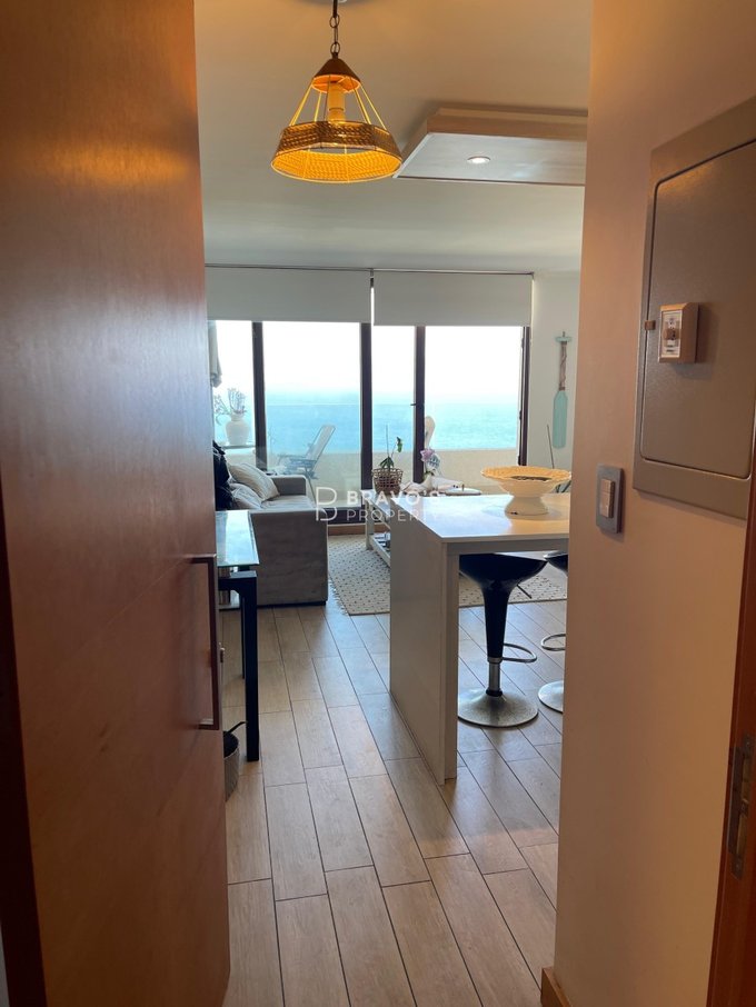 Cuenta con 2 dormitorios en suite, cocina americana integrada y una amplia terraza con vista totalmente despejada al océano. Superficie total: 76,97 m (aprox. 14 m de terraza). Piso 22 en edificio moderno del año 2021. Incluye estacionamiento y bodega. Acepta mascotas.