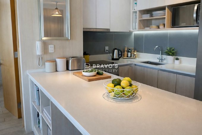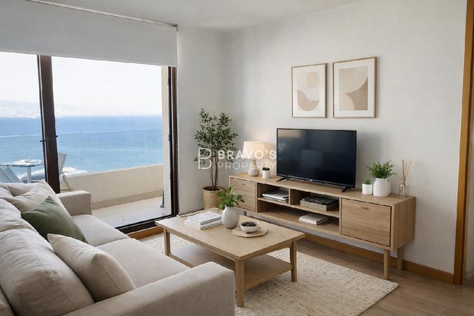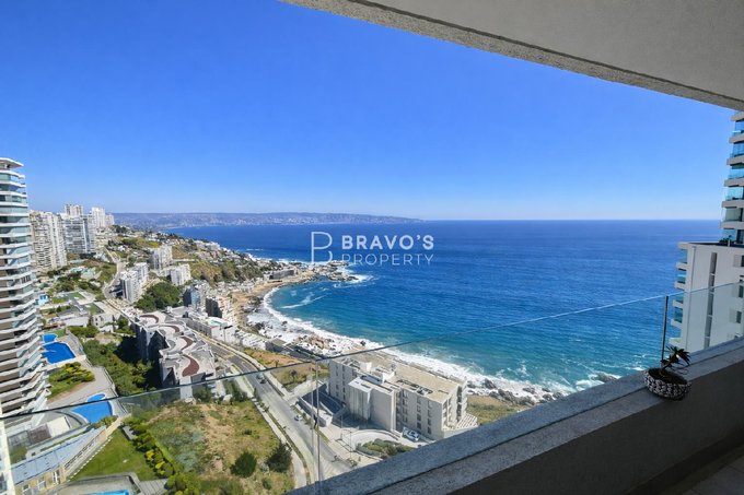 Cuenta con 2 dormitorios en suite, cocina americana integrada y una amplia terraza con vista totalmente despejada al océano. Superficie total: 76,97 m (aprox. 14 m de terraza). Piso 22 en edificio moderno del año 2021. Incluye estacionamiento y bodega. Acepta mascotas.